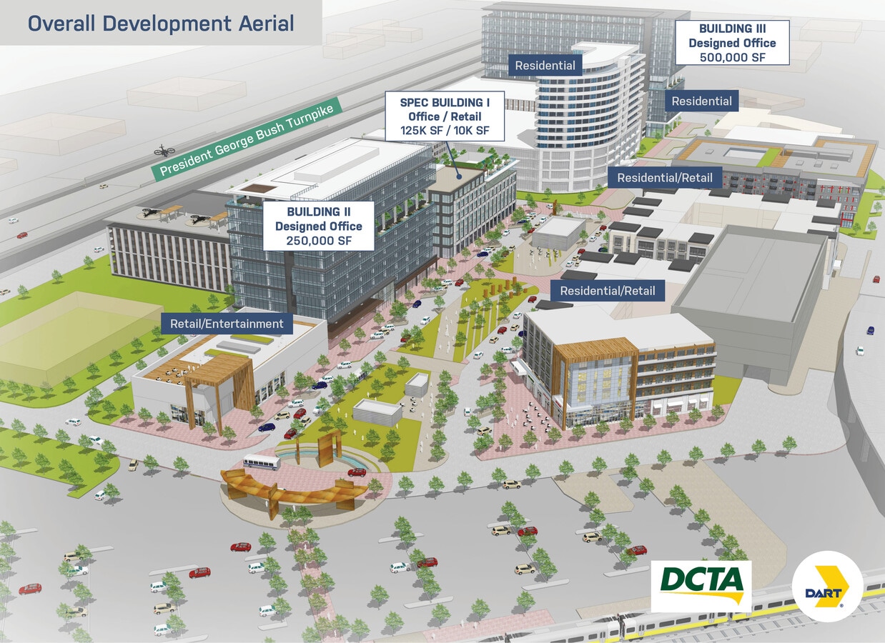 Thoughtfully developed in the heart of Carrollton, along the Dart Green Line & DCTA Train Line, this innovative, walkable, mixed-use property embodies a convergence of commerce, culture, and community. Trinity Mills Station will house class-A office buildings, luxury apartment homes, entertainment, retail and a hotel within public plazas and promenades that create a new, vibrant Carrollton neighborhood. The site’s design will distinguish itself through its urban spaces, pavilion structures, and active Market Plaza at the center of the Great Lawn. This modular space will serve as the social center to the new development, a lawn area for casual enjoyment, or a special event area for concerts and public markets.